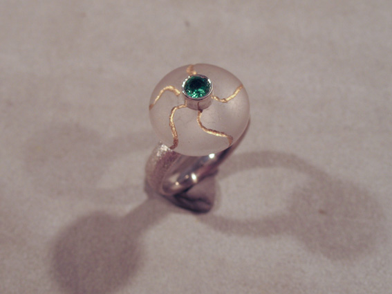 Ring, Silber mit Bergkristallbutton der mit Feingold verziert ist und Turmalin / ring with quartz decorated with fine gold and tourmaline