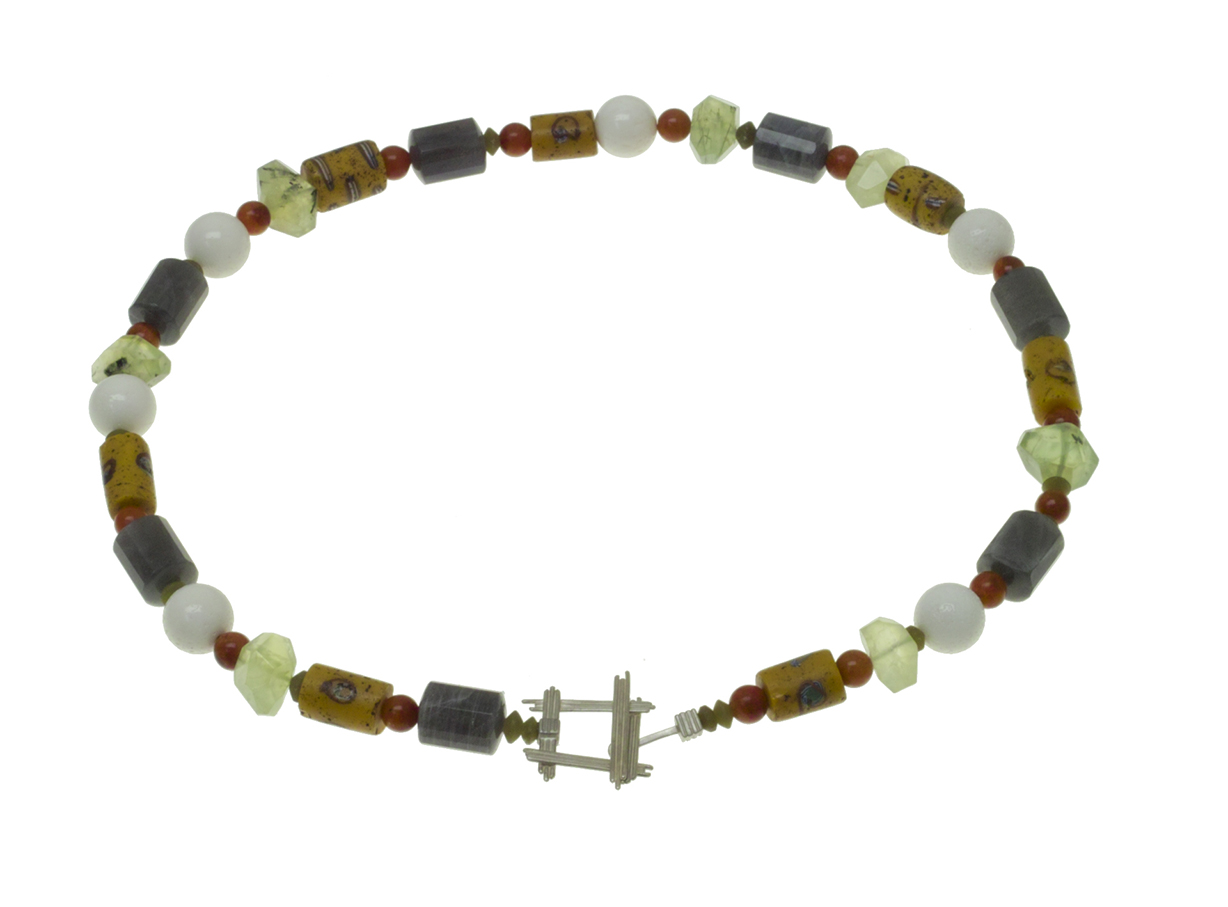 Kette, Koralle, Labradorit, Serpentine, Muranoglassperlen, Granat, Silberschloss / chain, coral, serpentine, labaradorite, granet